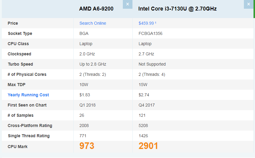 So sánh cấu hình tốc độ giữa CPU AMD A6-9200 vs Intel i3-7130U